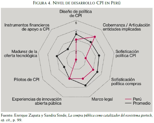 Por su parte, el Banco de Desarrollo de América Latina (CAF) ha elaborado el documento "La compra pública como catalizador del ecosistema de govtech"38, mediante el cual se analiza de manera práctica cómo las CPI pueden convertirse en un instrumento de política pública de innovación para promover ecosistemas govtech39. Asimismo, dicho organismo internacional ha evaluado el nivel de desarrollo de la CPI en Perú40, señalando como principales actores al Gobierno del Perú, el Ministerio de Producción, el Ministerio de Economía y Finanzas, el OSCE e Innóvate Perú, dando como resultado lo presentado en la figura 4.