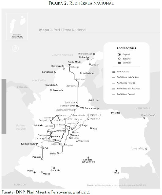 Como vimos, desde mediados del siglo XX, el ferrocarril pasó a un segundo plano en materia de infraestructura de transporte en Colombia. Esto, habida cuenta de que, en un primer momento, la retribución de la operación no superaba la inversión y, en un segundo momento -con la nacionalización en 1954-, salió a relucir la ineficiencia del aparato burocrático. Por lo cual, hoy contamos con los poco más de 3.000 kilómetros ferroviarios (figura 2). que teníamos hace cien años y de los cuales más del 68 % están inactivos59.