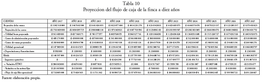 Teniendo en cuenta que el cultivo de banano tiene resultados a mediano plazo (nueve meses) y adicional a lo hay diferentes labores culturales como renovación de plantas y chopeos, con lo cual se espera que el cultivo tenga una vida util promedio de diez años, es por ello que se realizó una proyeccion del flujo de caja a diez años (ver tabla 8).