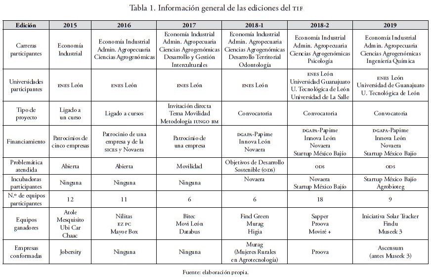 En el año 2015, como parte de la materia de Mercadotecnia de la Licenciatura en Economía Industrial de la enes León surge el evento de emprendimiento denominado Talents and Innovation Forum (TIF); en sus dos primeras ediciones el evento estuvo ligado a algún curso y representó un proyecto escolar. En 2017 se eligió trabajar en el tema de movilidad y se llevó a cabo bajo la metodología IUNGO BM4, se realizó una invitación directa a los participantes. Es a partir de la cuarta edición, 2018-1, cuando se da un cambio disruptivo en la operación del TIF, en ésta se incluyen los siguientes elementos: (a) emisión de una convocatoria; (b) invitación a estudiantes de otras universidades; (c) capacitación formal a través de un seminario de innovación y creatividad; y (d) inclusión de incubadoras del sistema Novaera para que los equipos ganadores pudieran concretar sus proyectos. La tabla 1 presenta información general de las seis ediciones que hasta el momento han tenido lugar.