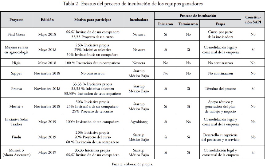 En la tabla 2 se presenta el estatus del proceso de incubación de los equipos ganadores. Como puede verse, 77,78 de los equipos ganadores llevaron a cabo su proceso de incubación; sin embargo, no todos los miembros de los equipos que realizaron este continuaron, sólo lo hizo el 66,67%.