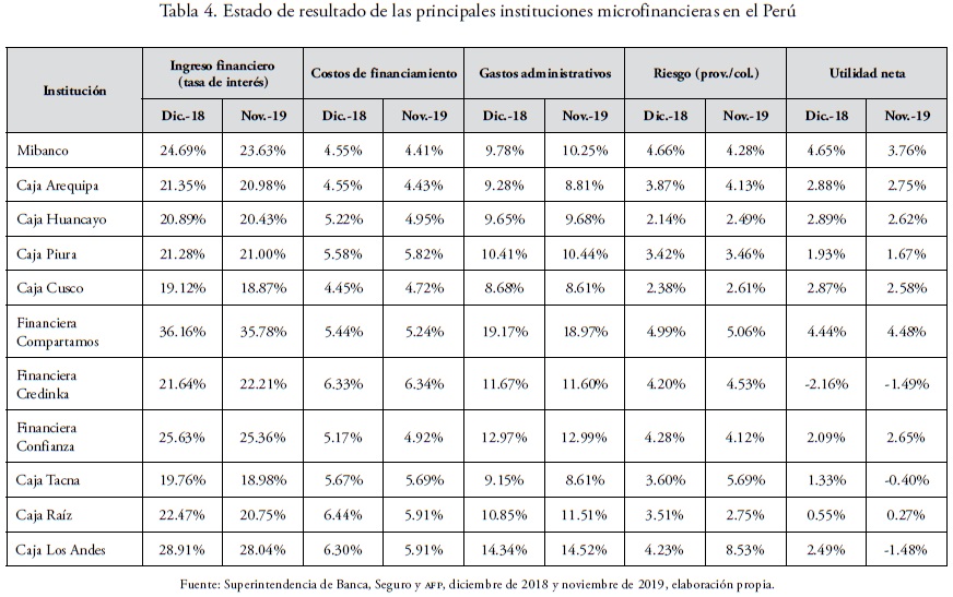 Según la información de la Superintendencia de Banca, Seguro y AFP, la tasa promedio que otorgan las entidades microfinancieras a los clientes de la micro y pequeña empresa a diciembre del 2019 está en 29,32%, evidenciando su caída en el tiempo; (información de Cajas Municipales, Cajas Rurales, Edpymes y la Banca Múltiple).
