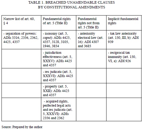 The first three columns demonstrate: 1) the recognition of unamendable clause explicit in art. 60, paragraph 4; 2) fundamental rights of art. 5; and 3) fundamental rights that are not in art. 5 but are still part of Title II. These contents can be considered explicit unamendable clauses because the amending power knows in advance the limits of its action. On the other hand, the last column corresponds to an indirect way of being implicit, once the competence is explicitly written. However, the content is open to being created by judicial constitutional interpretation.