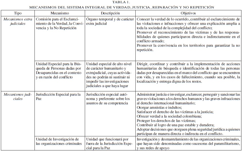 Este acuerdo plantea un Sistema Integral de Verdad, Justicia, Reparación y No Repetición (en adelante, el Sistema) bajo los objetivos de la satisfacción de los derechos de las víctimas, el establecimiento de responsabilidades de todos los participantes en el conflicto (directos o indirectos, combatientes o no combatientes), la no repetición para impedir nuevas formas de violencia y habilitar la convivencia y la reconciliación, y la seguridad jurídica y el debido proceso para sus participantes. Uno de los "paradigmas orientadores del componente de justicia" es la aplicación de una justicia restaurativa, "que preferentemente busca la restauración del daño causado y la reparación de las víctimas afectadas por el conflicto, especialmente para acabar la situación de exclusión social que les haya provocado la victimización" (p. 144). La justicia restaurativa atiende prioritariamente las necesidades y la dignidad de las víctimas y se aplica con un enfoque integral que garantiza la justicia, la verdad y la no repetición de lo ocurrido. Con dichos objetivos, el Sistema está compuesto por mecanismos judiciales y extra judiciales que se pueden resumir en la siguiente tabla 1.