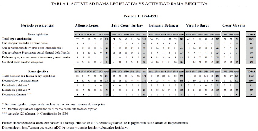 Con el fin de corroborar esta afirmación e identificar en qué medida la actuación unilateral del ejecutivo se ha llevado a cabo a través de una u otra figura, se estudian los decretos con fuerza de ley que ha expedido el presidente en los años comprendidos entre 1974 y 201424. Estos cuarenta años se dividieron en dos segmentos atendiendo a la expedición de la Constitución de 1991 (6 de julio). La elección de esta reforma constitucional como el hecho que fracciona el periodo se explica en las profundas transformaciones que esta supuso sobre el ejercicio del poder presidencial y, en especial, de las facultades legislativas del presidente. Conviene advertir que este trabajo aborda al poder ejecutivo como institución de forma que el objeto de estudio no son los presidentes puntuales que componen el periodo. No obstante, teniendo en cuenta que existen variaciones en la forma en que se ejerce la facultad de expedir decretos con fuerza de ley dentro un mismo segmento y que, por tanto, no pueden ser explicadas a partir de cambios normativos, se hace referencia a algunas particularidades que pueden atribuirse a un presidente concreto y que son utiles en la medida en que permitirían, en futuras investigaciones, establecer relaciones entre la actuación unilateral del ejecutivo y las circunstancias políticas a las que este se enfrenta.