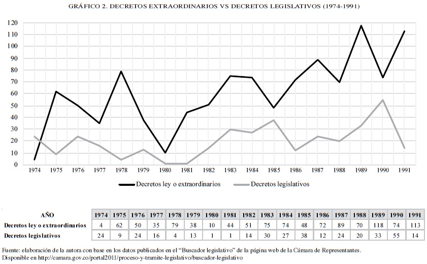 En cuanto a los decretos ley o extraordinarios, de las 211 leyes sancionadas por el Congreso que acompaña a Alfonso López Michelsen, 15 revisten al presidente de facultades extraordinarias y dan lugar a la expedición de 219 de estos decretos. Esto quiere decir que el 74.48% de la función legislativa ejercida por el ejecutivo durante este mandato no es arrebatada haciendo uso de la figura de los estados de excepción sino delegada expresamente por el Parlamento. Si a esto se suma un análisis cualitativo que solo tenga en cuenta la importancia de los asuntos sobre los que decide el Congreso, se puede afirmar que su actividad fue todavía muchísimo inferior pues, las "leyes importantes" que aprueba representan apenas un 38.38% del total de su actividad. No obstante, fue Virgilio Barco el presidente que más recibió del Congreso facultades extraordinarias para legislar. A partir de 27 delegaciones, Barco expide 349 decretos mientras que el Congreso aprueba - sobre las mismas materias de las que se ocupan estos decretos- 129 leyes. Según esto, la actividad legislativa del parlamento representa apenas un 36.96% de la ejercida por el ejecutivo. Por su parte, el gobierno de Belisario Betancur, es el segundo en expedir el mayor número de decretos con fuerza de ley en virtud de leyes de facultades extraordinarias. Con la firma de 265 decretos extraordinarios casi que duplica las leyes aprobadas por el Congreso que versan sobre las mismas materias. Gaviria expide, en apenas dos de los cuatro años que componen su mandato, 122 decretos extraordinarios a partir de 11 leyes que le otorgan facultades extraordinarias. Proporcionalmente, de nuevo es Turbay el que menos uso hace de estas facultades pese a recibir casi tantas delegaciones como los demás presidentes de este periodo. El número de decretos extraordinarios expedidos, que tampoco representa una cifra nada despreciable, equivale casi al doble de las leyes aprobadas por el parlamento (gráfico 2).