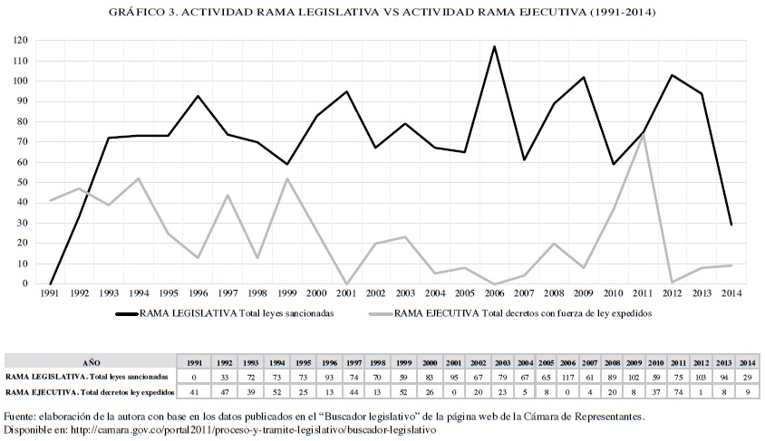 24 Para el estudio de la actividad de las ramas ejecutiva y legislativa se han utilizado los datos recopilados en el "Buscador legislativo" de la página web de la Cámara de Representantes del Congreso de la República de Colombia. Así mismo, se utilizó la clasificación en él propuesta para agrupar las leyes y decretos expedidos desde 1968.