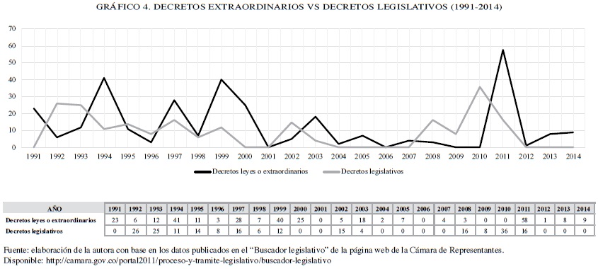 Por otro lado, la reducción tanto de los decretos legislativos como de los decretos extraordinarios a partir de la expedición de la Constitución de 1991, pone en evidencia que los cambios institucionales han jugado un papel importante sobre el ejercicio de la función legislativa por parte del presidente. En el segundo periodo (1991-2014), la función legislativa que lleva a cabo el Congreso es tres veces mayor a la ejercida por el ejecutivo. Este hecho puede explicarse en una disminución de las leyes de facultades extraordinarias y de los casos en los que el presidente ha recurrido a la declaración de un estado de excepción y que puede atribuirse a los límites impuestos por el constituyente de 1991. Pero, aun cuando se reducen los decretos con fuerza de ley en el segundo periodo, los decretos extraordinarios siguen representando un 62.39% del total de decretos expedidos, lo cual significa que el ejercicio de la función legislativa obedece, principalmente, a la delegación expresa que ha hecho el Congreso de las funciones que le corresponden y no a usurpación por parte del ejecutivo.
