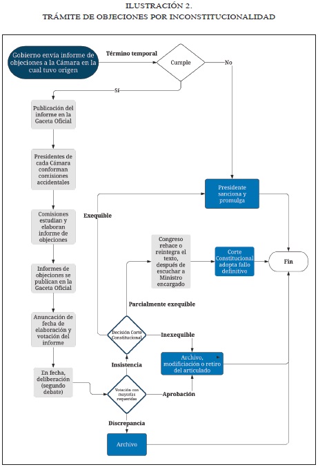 El Gobierno Nacional envía un informe de objeciones al Congreso de la República, a la cámara en la cual tuvo origen el proyecto de ley25. Dicha radicación debe estar dentro del término temporal (véase la tabla 1). Si no se encuentra dentro de dicho plazo, el presidente de la República deberá sancionar y promulgar el proyecto; por el contrario, si cumple el término, el informe de objeciones se debe26 publicar en la Gaceta Oficial para el conocimiento de ambas plenarias27. Una vez esté publicado, los presidentes28 de cada cámara conforman29 comisiones accidentales, las cuales deberán estudiar y elaborar30 un informe relativo las objeciones gubernamentales31. Escritos los respectivos informes, estos se deberán publicar en la Gaceta Oficial. Posteriormente, el Senado de la República y la Cámara de Representantes anunciarán de forma clara, determinada o determinable32 la fecha para la deliberación y votación de los informes de ponencia33. En la fecha estipulada se hará el llamado a lista34 y se surtirá la deliberación de las ponencias -como si se tratase de un segundo debate del proyecto de ley35- y se efectuará la votación de acuerdo a las mayorías requeridas36. El resultado de esta votación, puede derivar tres posibles escenarios: (a) las cámaras insisten en el proyecto de ley, por lo que el presidente de la República procederá a sancionar y promulgarlo37; (b) discrepancia en la votación de las cámaras, de manera que se archivará el proyecto38; y (c) aprobación de las objeciones, por lo que se archiva la iniciativa, se retira o se modifica la parte objetada, según lo haya solicitado el Gobierno39.