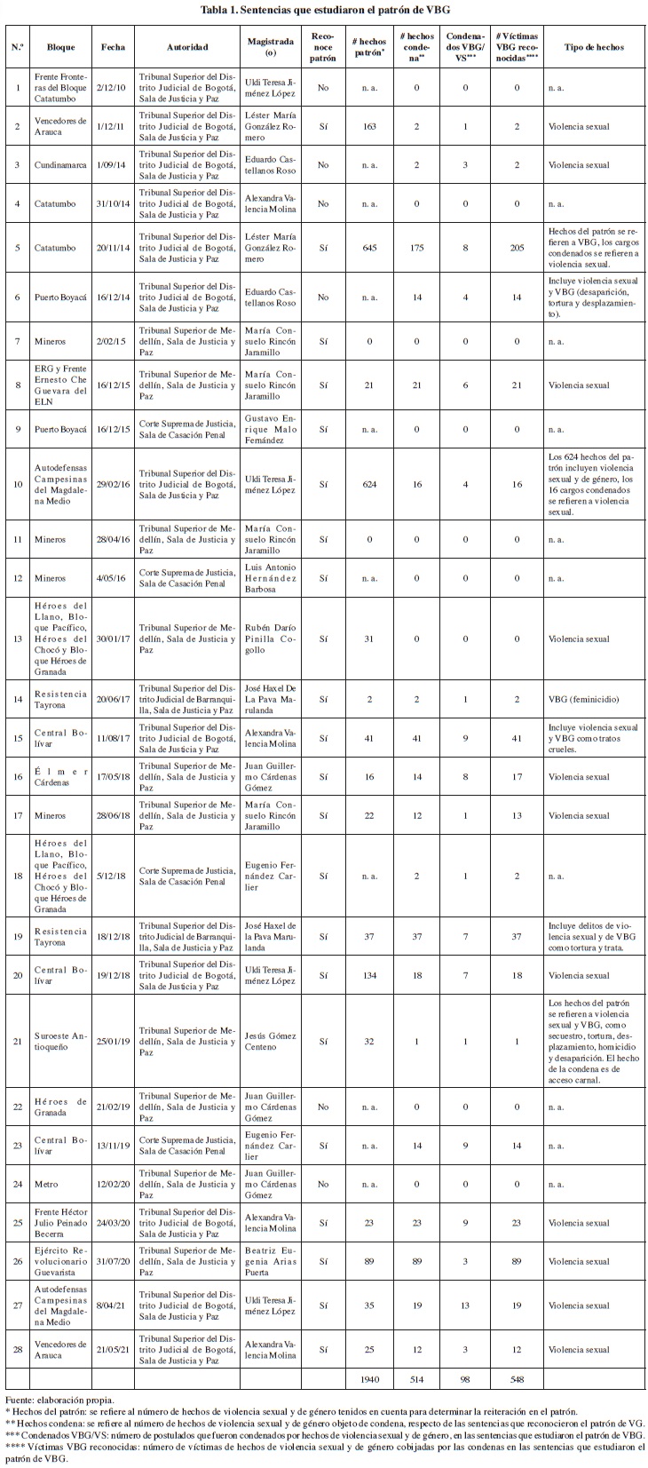 Como se observa en la tabla 1, en estas sentencias fueron reconocidos al menos 1940 hechos de violencia sexual y de género para estudiar el patrón de VBG, de los cuales fueron objeto de condena al menos 514, que involucraron a 548 víctimas y de los cuales se declaró responsabilidad penal a 98 postulados.