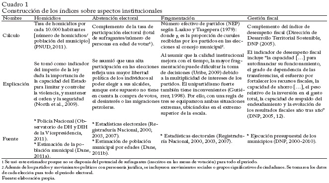 La calidad institucional se representa mediante indicadores que combinan aspectos como la protección de derechos de propiedad, la eficiencia judicial, la capacidad de control de la sociedad civil, la capacidad del Estado para mantener el orden, la seguridad y el manejo fiscal7. El imperio de la ley y la eficiencia del gobierno son variables que reiteran todos los estudios, y el trabajo de Perry y Olivera (2009), a nivel municipal y departamental, subraya la importancia de indicadores políticos como el imperio de la ley y la fragmentación política. Por su parte, el desarrollo humano exige incluir los siguientes aspectos institucionales: estabilidad laboral, participación electoral, corrupción, fragmentación política, imperio de la ley y eficiencia del gobierno (Anexo 1). La estabilidad laboral incide en la estabilidad del ingreso y el acceso al trabajo (libertad económica) y la participación electoral influye en la elección de la senda de desarrollo (libertad política). Y frente a las condiciones relacionadas con el gobierno para ampliar las libertades son importantes la honestidad de los funcionarios, la atribución de poder de los concejos municipales (fragmentación política), y la capacidad del Estado para mantener el orden (imperio de la ley) y el manejo fiscal (eficiencia del gobierno).