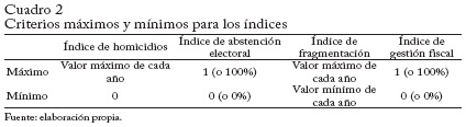 Los cuatro aspectos institucionales mencionados se formalizaron mediante los elementos que presenta el cuadro 1. Y para construir cada índice se recurrió a la fórmula general que usan los informes nacionales de desarrollo humano (PNUD, 2003): Índice = (Xiefec - Xi-min)/(Ximax - Ximin), donde Xiefec es el valor efectivo de la variable del municipio, Ximin es el valor mínimo y Ximax es su valor máximo. Los máximos y mínimos de cada uno se definieron como se muestra en el cuadro 2. Cada índice varía en una escala de 0 a 1, donde 0 es el mejor resultado y 1 el peor.