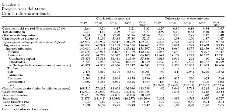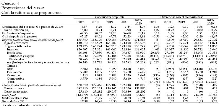 - Los cuadros 4 y 5 presentan los principales resultados del ejercicio. El cuadro 4 muestra los resultados de la propuesta de reforma y los compara con los del escenario base. El cuadro 5 presenta las proyecciones correspondientes a la reforma aprobada en diciembre de 2016, también comparadas con las del escenario base. Los resultados que arroja el MEGC para nuestra propuesta no son sorprendentes dadas sus características, en particular no aumentar el IVA, salvo en los casos indicados. Comparados con los que se obtendrían en el escenario base -sin reforma-, los ingresos tributarios se verían casi inalterados en el primer año de la reforma (reducción de 5 mil millones de pesos). Sin embargo, en los años siguientes serían muy superiores (9,9 billones de pesos en 2018, 18,0 billones en 2019 y 20,8 billones en 2020). De modo que el recaudo promedio anual en los cuatro años de proyección de la propuesta sería mucho mayor que en el escenario base (12,2 billones de pesos más).