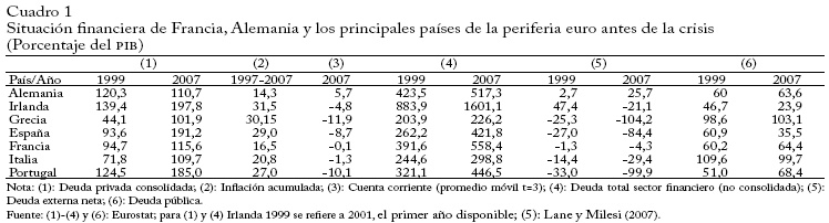 La crisis europea efectivamente llegó desde afuera5. El colapso del sistema financiero norteamericano impactó directamente al sistema europeo, en razón de la exposición a activos tóxicos, particularmente alta en el caso del sistema bancario alemán y francés, e indirectamente, vía reducción de la demanda de Estados Unidos y de Asia. Cuando los bancos del centro del sistema europeo fueron golpeados, pretendieron reducir la exposición que tenían dentro del continente, y resultó que esta exposición afectaba prevalentemente la periferia del sistema euro.