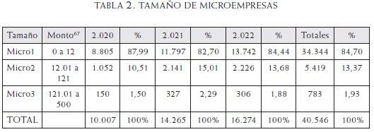 En el ámbito de las microempresas, el Centro de Estudios de la Empresa Micro45 hace a su vez una sub-clasificación para el año 2022, según el tamaño, partiendo de los activos totales y conforme a la noción que trae la Ley 905 de 2004, así: micro1, hasta $12.000.000; micro2, de $12.000.001 a $121.000.000; y micro3, de $121.000.001 a $500.000.000. Para actualizar esos valores absolutos es suficiente recordar que para el año 2022 dicho salario mínimo legal era de $1.000.000.