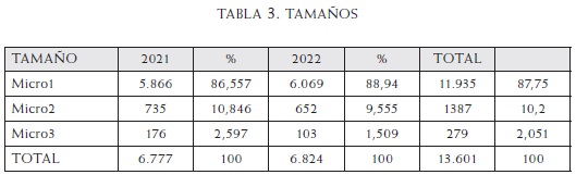70 La tabla original es tomada de CEM2 (2022) que se modifica para agregar el porcentaje según el tamaño.