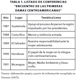 En 1987, la primera dama de Guatemala, Raquel Blandón (1986-1991), organizó el primer "Encuentro de las primeras damas centroamericanas" con el fin de apoyar el proceso de paz de la región. La tabla 1 muestra las reuniones realizadas y los temas abordados.