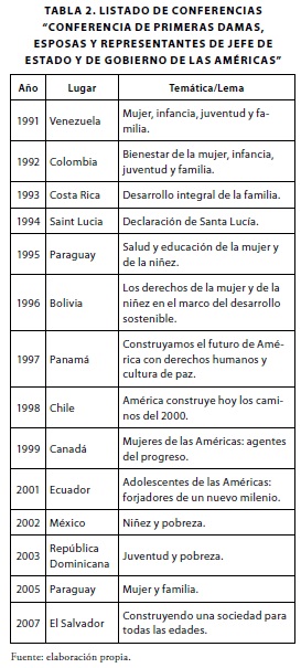 Todas las conferencias realizadas demuestran la activa participación política de las primeras damas a nivel regional ya que en estos encuentros se compartían buenas prácticas de políticas públicas, se generaban alianzas y se elaboraba un plan de acción conjunto. Estas actividades también sirven para observar cuáles son los temas que priorizaron las primeras damas, ya que cada año se definió un lema específico. En este sentido, también es posible observar a través de los debates la ideología de cada una. Giordano (2023) indica que una cantera donde tallar la "agenda de género" de las mujeres de derecha son los debates de las reuniones de la Cumbre de primeras damas de las Américas, en las que las visiones acerca del rol de las mujeres abonan ideas vinculadas al imaginario maternalista tradicional.