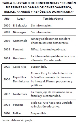 En el año 2000 se retomaron las reuniones en América Central con la creación de la "Reunión de primeras damas de Centroamérica, Belice, Panamá y República Dominicana" con el auspicio del Instituto Interamericano del Niño (IIN) de la OEA, gracias a la iniciativa de la primera dama de la República de El Salvador, Lourdes Rodríguez de Flores (1999-2004), con el fin de compartir experiencias exitosas en materia de herramientas tecnológicas modernas para conocer la situación real de la niñez y la adolescencia en los países de la región, que sirvieran de base para orientar las políticas y los planes nacionales en torno a la protección y el desarrollo integral de niñas, niños y adolescentes, en especial, aquellos y aquellas que viven en situación de riesgo y exclusión social (Dominicana, 2000). Por ello, la mayoría de los temas tratados en la conferencia se refieren a infancias y adolescencias. Las reuniones realizadas se presentan en la tabla 3.
