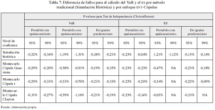 El análisis de la diferencia promedio de los fallos para el es (tabla 7) muestra que, en magnitud, el ajuste de EVT y cópulas ayuda reducir la diferencia entre el PyG y el es al 95 % de confianza para los casos con y sin apalancamiento, donde las cópulas t y gaussiana son las que disminuyen dicha diferencia en mayor medida. Por otra parte, para el caso del portafolio con apalancamiento al 99 % no hay fallos para los tres casos con ajuste de EVT-Cópula. Por último, en presencia de iguales ponderaciones al 95 %, la menor diferencia se da para simulación histórica, y al 99 % para la cópula t, mientras que para la cópula de Clayton no se presentan fallos.