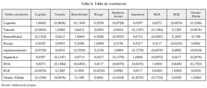 Finalmente, una vez construida y clasificada la muestra se hizo un análisis de colinealidad entre las variables. De este resultado se observó la existencia de colinealidad en las variables de ROA y ROE, por lo cual se pasó a realizar un análisis de correlaciones parciales existentes entre las variables, la cual arrojó el resultado que se presenta en la tabla 6.