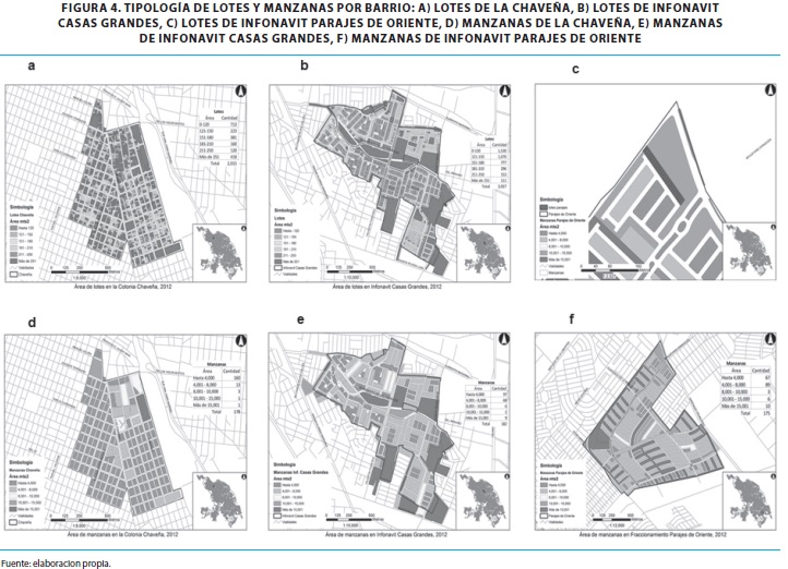 En el Infonavit Casas Grandes, predominan los lotes de hasta 120 m2, con algunas zonas con lotes de 151 a 180 m2, y los de más de 211 m2 corresponden a áreas de donación y parques. De modo que se puede decir que, comparado con La Chaveña, presenta mayor densidad habitacional y menor mezcla variada de tamaños y tipos de lotes. Predominan las manzanas que cubren una superficie hasta los 4000 metros cuadrados. Se trata de una forma urbana semirregular y proyectada, con una mezcla de calles curvas y lineales, que crean núcleos de viviendas dentro del barrio (figura 4 b y e).