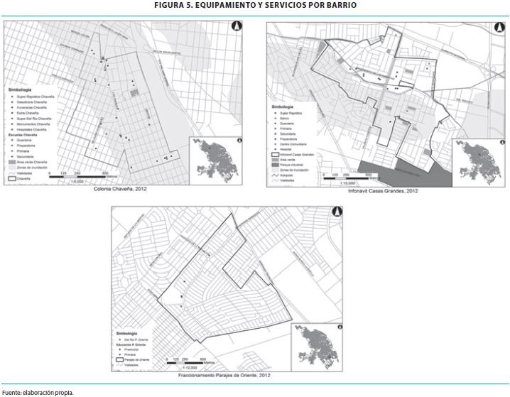 Este aspecto parece seguir la misma lógica del espacio público, la cantidad y sobre todo la diversidad de oferta parecen ser la clave, pues aunque en términos de la dotación recomendada por Sedesol, los tres barrios cumplen, si no en su interior, al menos en un radio de 30 minutos, en La Chaveña no solo hay cantidad, sino diversidad de equipamiento, oferta que disminuye en 50 % en el barrio intermedio y en alrededor de un 90 % en el barrio periférico: en La Chaveña existen 30 facilidades de servicios y equipamientos (hospitales, escuelas, parques, supermercados, funerarias, comercios, entre otros), el Infonavit Casas Grandes cuenta con 15 facilidades de este tipo y Parajes de Oriente, solo con 5 facilidades (una tienda de conveniencias Del Río, dos preescolares y dos primarias). Esta población, de 7063 ha bitantes, no cuenta con ningún servicio de salud o puesto de socorro en la proximidad.