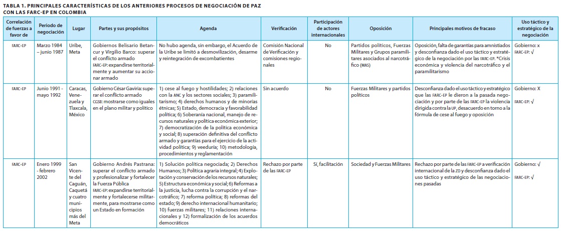 Desde 1982, el Gobierno colombiano y las FARC-EP han iniciado diálogos con el objetivo de poner fin al conflicto, aunque sin apartarse de la confrontación armada (Gutiérrez, 2012). Según Chernick (2015), cada Gobierno de turno ha estado determinado por el intento de alcanzar la paz y, de acuerdo con López, (2016), cada uno ha enfrentado con diferentes diagnósticos y fórmulas el conflicto. Por tanto, es necesario identificar el porqué del fracaso en las anteriores negociaciones con las FARC-EP. Para esto se analizarán las principales características de estos procesos, que se presentan de manera resumida en la tabla 1.