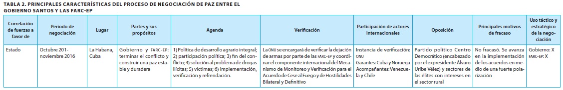 Al igual que en el Gobierno de Gaviria, los diálogos se llevaron a cabo fuera del país y se continuó con la confrontación armada, con el fin de que la guerrilla no pudiera utilizar táctica y estratégicamente el escenario de la negociación para fortalecerse en lo militar. Tal y como lo menciona Echandía (2013), la agenda, a diferencia de los procesos anteriores, estuvo determinada por el estado del conflicto y por tal razón, es restringida, según González (2015). Dadas las condiciones internas, excepcionalmente este proceso de negociación contempla la verificación como uno de los puntos de la agenda de negociación, demostrando el compromiso de las partes con la superación del conflicto. En este proceso, como en el del Gobierno de Pastrana, se cuenta con la participación de actores internacionales. No obstante, y a diferencia de la negociación anterior, en este proceso se contempló la verificación, y además se contó con la participación de Cuba y Noruega como garantes23, y Chile y Venezuela como acompañantes24. Como en todos los procesos existe una oposición fuerte, que se evidenció en el plebiscito el 2 de octubre de 2016, día en que el 50,21 % de los votos válidos (Registraduría Nacional del Estado Civil, 2016) manifestaron no apoyar el "Acuerdo Final para la terminación del conflicto y la construcción de una paz estable y duradera".