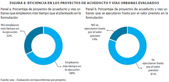 Respecto a calidad de la ejecución, se profundiza en la eficiencia de los proyectos evaluados. El 68 % de los proyectos presentan retrasos en su ejecución (ver panel a, figura 8). Entre las razones que explican esto se encuentran deficiencias en la formulación, como actividades no previstas, obras complementarias y cambio de diseños, factores climáticos, dificultades en el cumplimiento de cronogramas para el suministro de materiales y otros como permisos ambientales y temporada de vacaciones. En contraste, en lo que tiene que ver con recursos, es positivo que el 81 % de los proyectos se ejecutó hasta por el valor previsto en la formulación (ver panel b, figura 8).