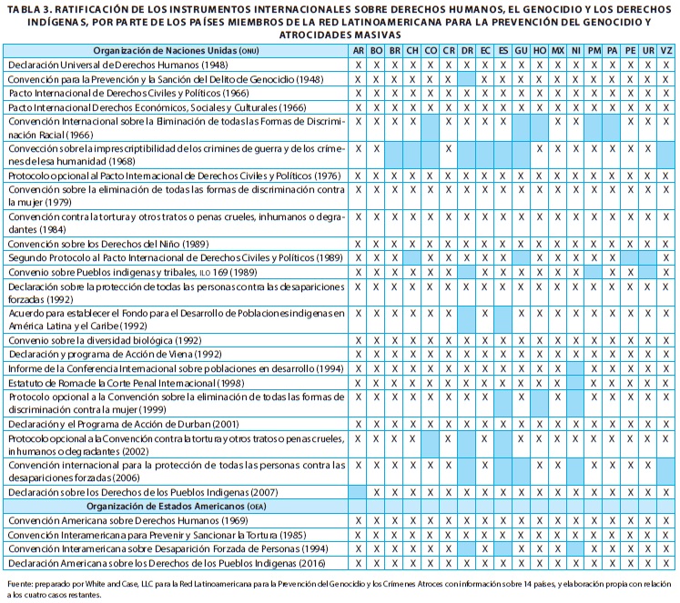 Como hemos señalado hay muchos acuerdos internacionales que obligan a los gobiernos signatarios a proteger los derechos de los PIO. En ese contexto, si alguien quisiera entender por qué continúan ocurriendo casos de violencia masiva contra los PIO, una razón hipotética podría asociarse a que en lugares donde estos son víctimas de genocidios u otras atrocidades esto ocurre porque los países no han ratificado ni firmado dichas leyes. Sin embargo, una vez examinamos los 23 acuerdos de la ONU más relevantes, junto a cuatro instrumentos de las OEA9, encontramos que de los 27 documentos incluidos en este análisis, tres explícitamente abordan el tema de las atrocidades masivas, cuatro resaltan los derechos de los PIO, y cinco tienen un énfasis regional en América Latina y el Caribe, o las Américas en general. Más importante aún, como se sintetiza en la tabla 3, esta revisión da cuenta de que la mayoría de los países en la región han ratificado la mayoría de los acuerdos en esta materia. Tres países -Bolivia, Costa Rica y México- han aceptado todos los acuerdos. Cinco países -Argentina, Brasil, Ecuador, Paraguay y Perú- solo han dejado de ratificar uno de los acuerdos; mientras que los diez países restantes han dejado de ratificar dos o más de los acuerdos internacionales; los casos de República Dominicana y El Salvador son dos de los más notables, ya que cada uno de ellos ha dejado de ratificar siete de esos acuerdos.