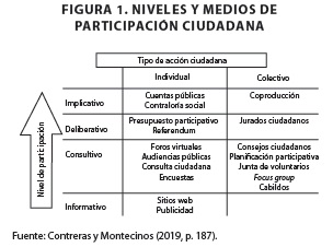 No solo es importante conceptualizar la participación ciudadana, sino destacar que existen diferentes niveles de participación, Arnstein (1969) considera tres niveles, el primero de ellos es el acceso a la información; el segundo es el consultivo; un tercer nivel es la verdadera participación en la que los ciudadanos pueden influir directamente en la política y en las políticas públicas; por su parte, Contreras y Montecinos (2019) suman un nivel más, al tener cuatro niveles de participación: informativo, consultivo, deliberativo e implicativo.