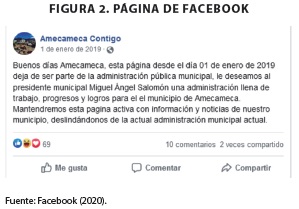 La página Amecameca Contigo, como medio de comunicación entre el gobierno municipal y la ciudadanía, alcanzó 7.291 personas que evidenciaron su gusto por la misma, mientras que 7.405 personas la seguían. En dicha página se específica que funcionó como "Página oficial del Ayuntamiento de Amecameca 2016-2018" (Facebook, 2020), en donde además de difundir el trabajo de la administración municipal se invitaba a la ciudadanía para dejar quejas, comentarios y denuncias.