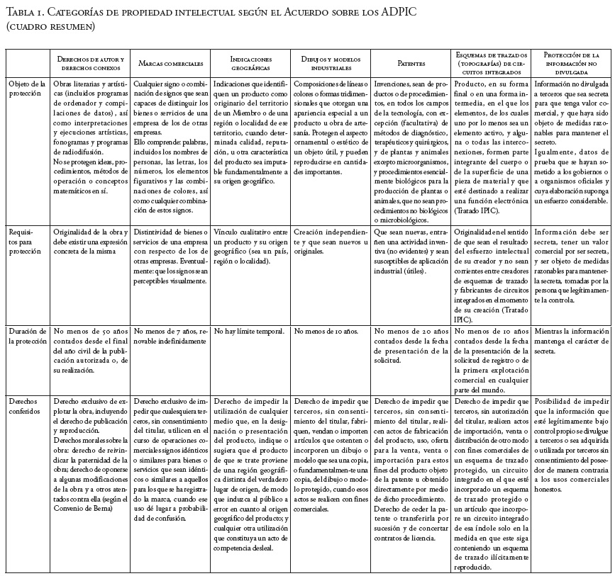 Con el objeto de reseñar las normas establecidas por el Acuerdo sobre los ADPIC con respecto a las distintas categorías de propiedad intelectual, presentamos a continuación un cuadro sinóptico que resume el contenido básico sobre esa materia. Dichas tablas fueron elaboradas apegándose al texto legal del Acuerdo sobre los ADPIC, pero en algunos casos complementándolo para fines de claridad con los convenios de París y Berna y con un documento base de la OMPI22.