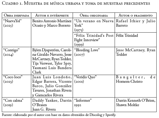 Esta práctica se está volviendo común y en el caso de la música urbana es aún más claro, pues suele usar fragmentos de otras canciones, como por ejemplo los temas mostrados en cuadro 1.