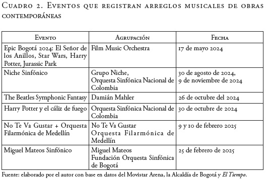 En el ámbito del arreglo musical, algunas agrupaciones como orquestas, bandas y coros musicales requieren de modificaciones orquestales de una canción para reinterpretar obras contemporáneas o de gustos de un público específico, por lo que es necesario hacer ajustes a los elementos de la obra musical. Ejemplo de ello son algunos de los eventos que se han realizado entre mayo de 2024 a febrero de 2025 en Colombia (véase el cuadro 2).