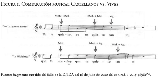 En Colombia, un caso que podría tener similitud es el de Carlos Alberto Vives Restrepo contra Liván Rafael Castellanos Valdés por las acusaciones de plagio en la obra "La bicicleta". El caso tuvo el peritaje del maestro Juan Antonio Cuéllar Sáenz, quien determinó la existencia de coincidencia rítmica en el coro, pero que indicó que la similitud ocurre por el lenguaje o estilo musical común, por lo que concluyó que no era un plagio, como se muestra en la figura 1.