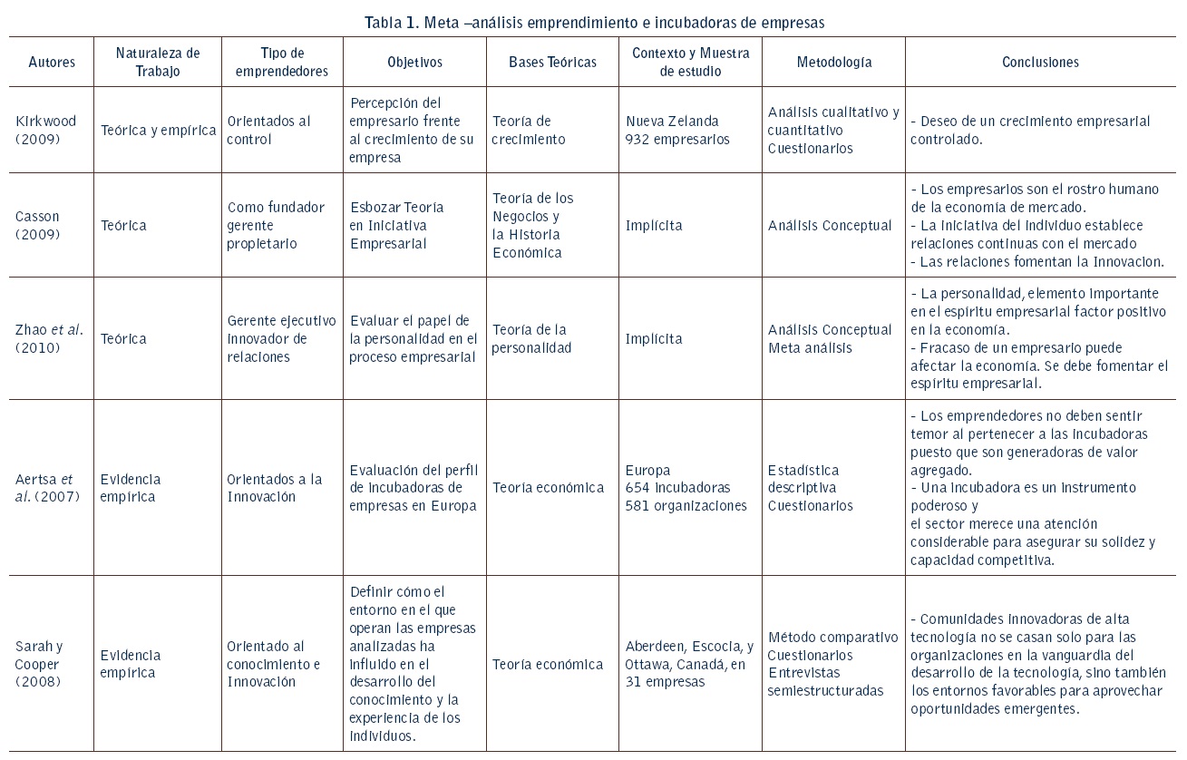 La presencia de empresarios constituye actualmente la base de la economía, por eso el fomento del espíritu empresarial es de vital importancia y la consideración de los rasgos de personalidad de los emprendedores constituye un factor básico en las iniciativas de promoción y desarrollo de ese espíritu (Zhao et al., 2010). El siguiente cuadro muestra la caracterización del tipo de emprendedores encontrados mediante un meta-análisis comparando varios estudios sobre el tipo de emprendedor, características y su relación con las incubadoras de empresas.