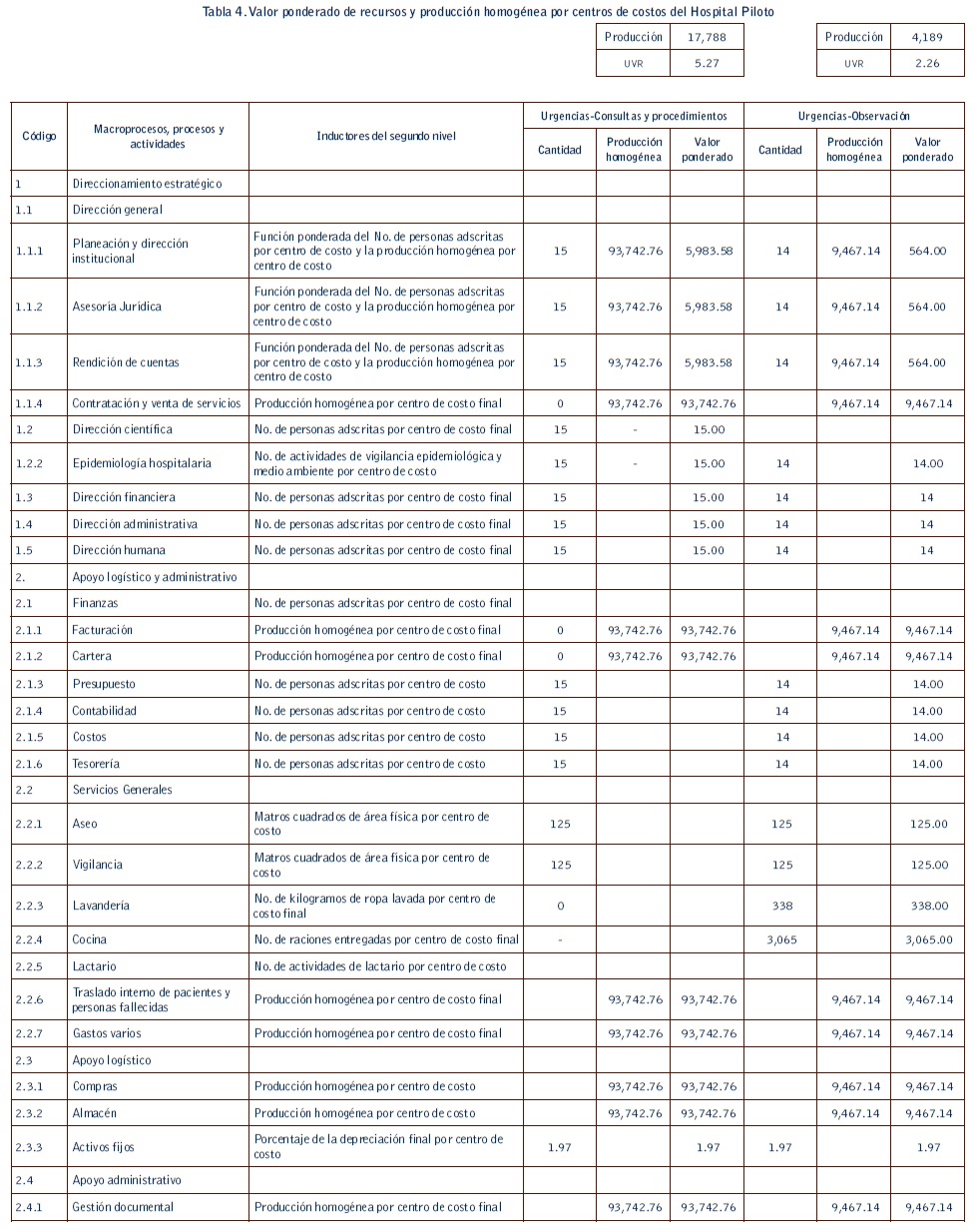 De esta manera, tanto los recursos asignados como la producción homogénea de cada centro de costos, no se verán afectados por valores extremos de cada uno de ellos. La Tabla 4, refleja los valores ponderados de recursos y producción homogénea por centro de costos.