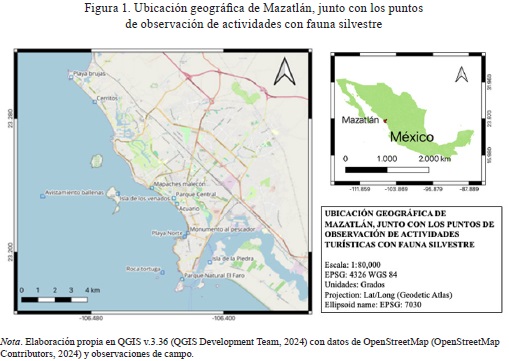 La ciudad de Mazatlán se ubica en la costa sur del estado de Sinaloa, en el noroeste de México (Figura 1). Su localización geográfica privilegiada, entre el mar de Cortés y la Sierra Madre Occidental, le confiere una gran diversidad de ecosistemas, incluidos playas, manglares, estuarios, islas e islotes, bosques tropicales secos y áreas marinas costeras. Esta riqueza natural alberga una notable biodiversidad, con cientos de especies entre aves, mamíferos, reptiles y otros grupos taxonómicos, algunas de ellas endémicas o en alguna categoría de riesgo. Al mismo tiempo, es uno de los destinos turísticos más importantes de México, con una infraestructura hotelera y de servicios bien desarrollada, y una afluencia anual de más de 2 millones de visitantes (SECTUR, 2023).