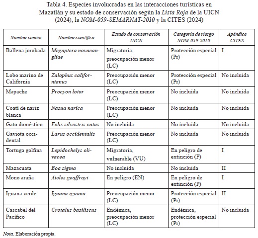 Las interacciones turísticas entre humanos y animales no humanos observadas en Mazatlán involucran a once especies de fauna silvestre y doméstica, cada una con sus propias características ecológicas y estado de conservación. La Tabla 4 presenta un resumen de las principales especies identificadas durante el estudio, junto con su nombre científico, categoría de amenaza según la Lista Roja de la UICN (Unión Internacional para la Conservación de la Naturaleza [UICN], 2024), la Norma Oficial Mexicana NOM-059-SEMARNAT-2010 (Secretaría de Medio Ambiente y Recursos Naturales [SEMARNAT], 2019) y su inclusión en los Apéndices I, II, III y IV de la Convención sobre el Comercio Internacional de Especies Amenazadas de Fauna y Flora Silvestres (CITES, 2024).