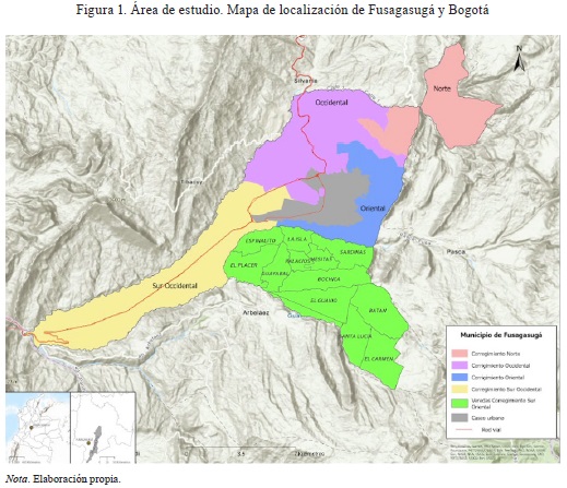 El área de estudio corresponde al corregimiento Suroriental de Fusagasugá (Figura 1), compuesto por doce veredas (La Isla, Sardinas, Bochica, Guayabal, El Guavio, Batán, Santa Lucía, El Carmen, Palacios, Mesitas, Espinalito y El Placer), con una extensión de 5680 ha (56,8 km2) y una población aproximada de 5677 habitantes. En él se concentra el 30 % de la población rural del municipio, organizada en torno a los acueductos veredales comunitarios (Alcaldía Municipal de Fusagasugá, 2020).