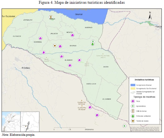Al analizar la información obtenida en el primer taller, se identificó la necesidad de conocer y profundizar sobre las relaciones e interrelaciones entre los diferentes actores territoriales. Por ello, en la segunda reunión, realizada en la vereda Bochica, se procedió a recopilar las iniciativas turísticas por medio de un formato estructurado y a establecer su localización utilizando un mapa base en Google Earth. Las iniciativas que no pudieron ser georreferenciadas durante el encuentro fueron localizadas posteriormente gracias a las ubicaciones enviadas por los participantes vía WhatsApp, lo que permitió obtener las coordenadas y complementar el archivo KMZ trabajado en el segundo taller. La Figura 4 muestra el mapa con las iniciativas turísticas identificadas y propuestas por la comunidad.