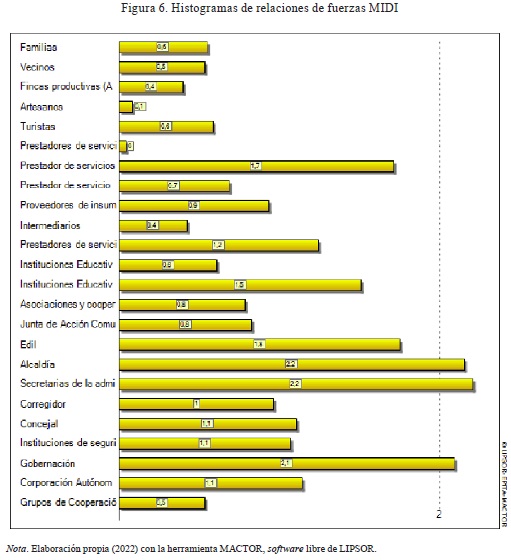 Los actores con alta motricidad en la MID, como las instituciones gubernamentales (p. ej.: la alcaldía) y las asociaciones comunitarias, ejercen una influencia directa y significativa sobre otros actores. Esto implica que pueden desempeñar un papel de liderazgo en el diseño e implementación de políticas y prácticas orientadas a la sostenibilidad, la conservación ambiental y al desarrollo de turismo regenerativo. Por ejemplo, estos actores pueden fomentar iniciativas como la protección y conservación de áreas verdes y el uso responsable de recursos naturales.
