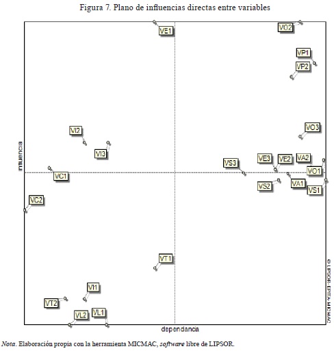 Este plano representa las influencias y dependencias actuales y potenciales entre variables. Además, completa la MID, pues toma en cuenta las relaciones que podrían hacerse visibles en el futuro. Las influencias se puntúan de 0 a 3 en la siguiente escala: sin influencia (0), débil (1), media (2) y fuerte (3).