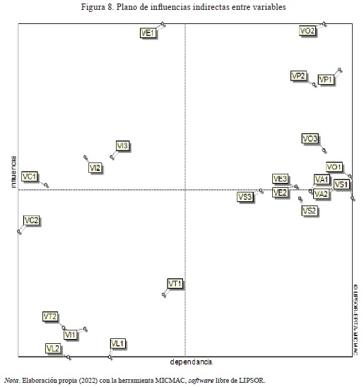 Este plano analiza las influencias y dependencias indirectas entre variables, análisis a partir del cual se revelan relaciones no evidentes en las influencias directas y es posible comprender cómo una variable puede afectar a otras por medio de conexiones indirectas. Esto es clave para identificar los flujos de impacto más profundos en el sistema.