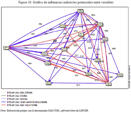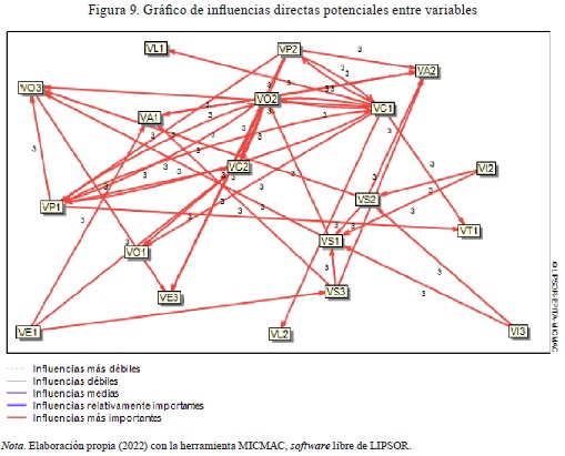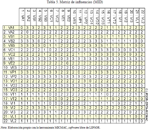 Esta matriz describe las relaciones de influencias directas e indirectas entre las variables que definen el sistema. Las influencias se puntúan de 0 a 3, con la posibilidad de señalar las influencias potenciales en la siguiente escala: sin influencia (0), débil (1), media (2), fuerte (3) y potencial (P).