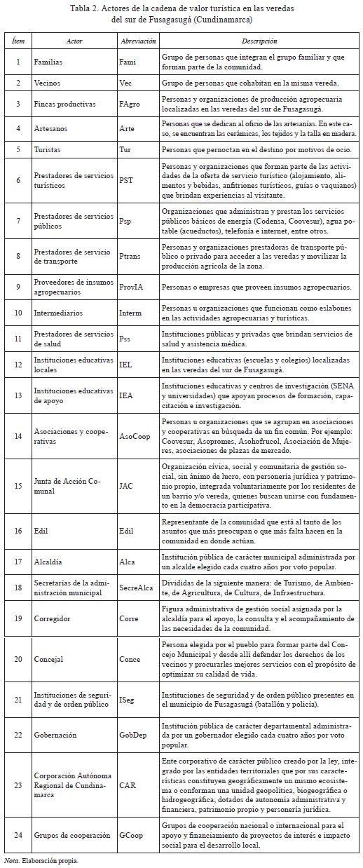 En cuanto a los actores de la cadena de valor, se identificaron 24 que viven e interactúan en el destino, los cuales se describen en la Tabla 2.