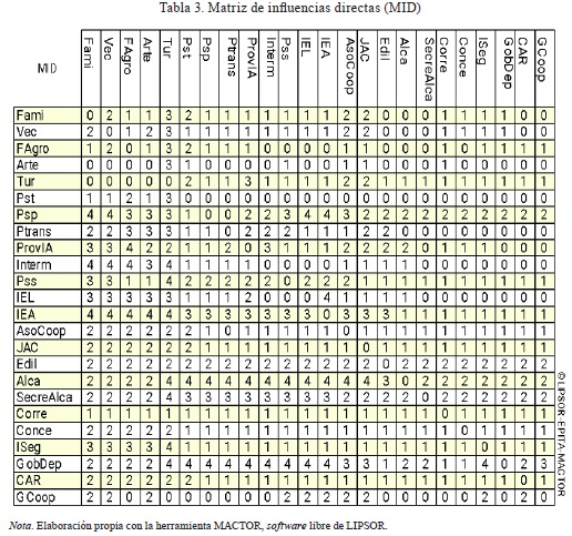 Considerando la importancia del impacto sobre cada actor, las influencias se puntúan de 0 a 4 de la siguiente manera: sin influencia (0), procesos (1), proyectos (2), misión (3), existencia (4). La Tabla 3 presenta la matriz de influencias directas (MID) obtenida.