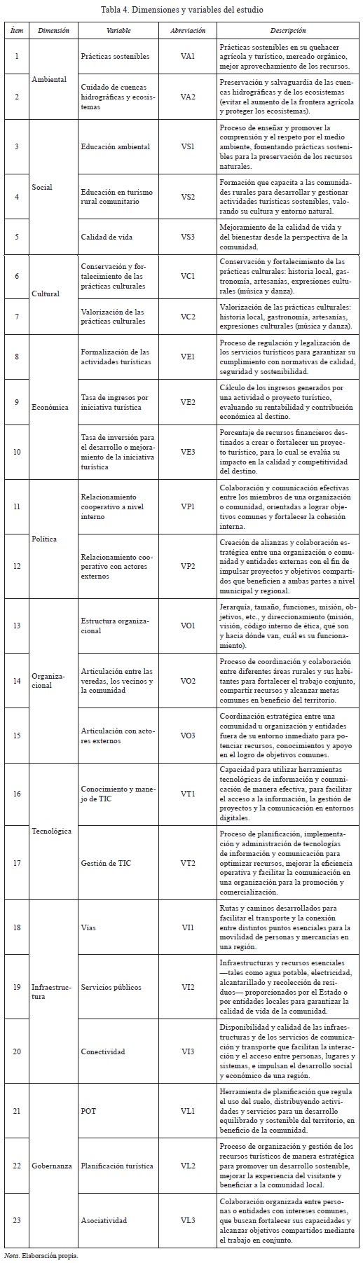 A partir del proceso de análisis de la información recolectada de fuentes primarias y secundarias, se establecieron 9 dimensiones y 23 variables, las cuales se presentan en la Tabla 4.